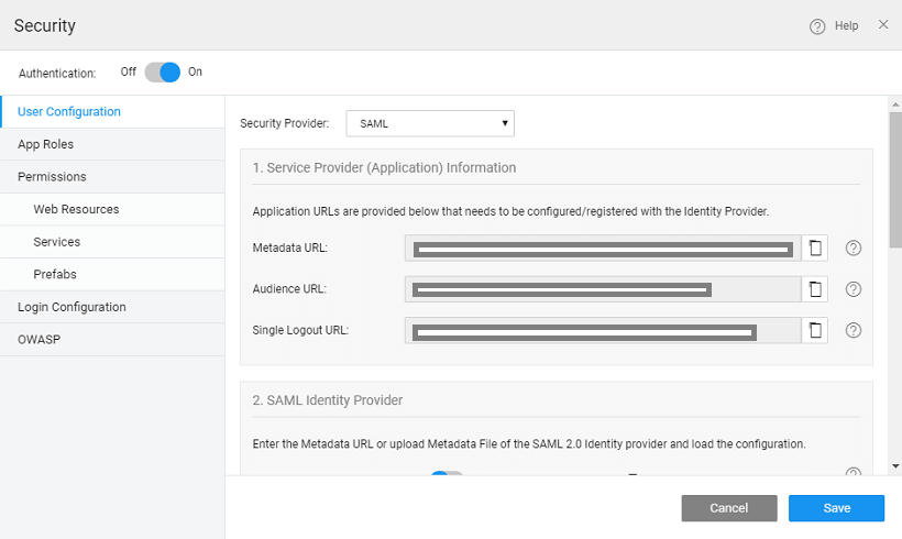 After enabling Security and on selecting SAML as the Security Provider for your app: