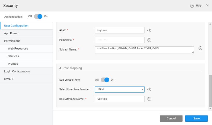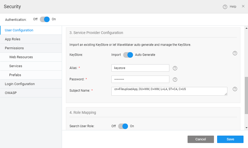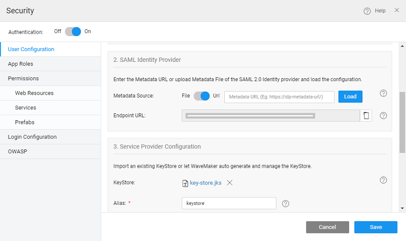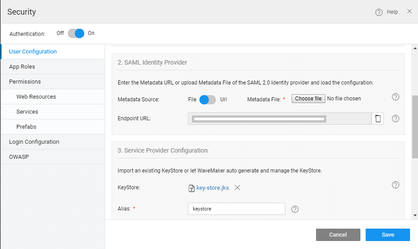 The SAML message exchange requires a public/private key pair for every participating entity in the message exchange. The Idp key pair is maintained by the IdP provider, but the Service Provider’s key pair should be maintained by the service provider, in this case, the WaveMaker application. In most of the production deployments, a valid key pair is recommended to be used, but during application development, WaveMaker helps in auto-generating a key pair for you which should be used only for demo purposes, but not for actual deployment.