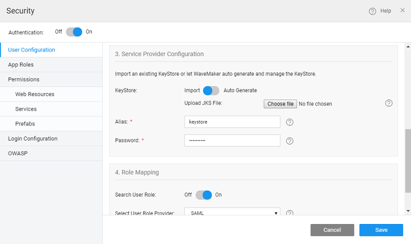 - Import - The user can import a java keystore into WaveMaker. The inputs required are