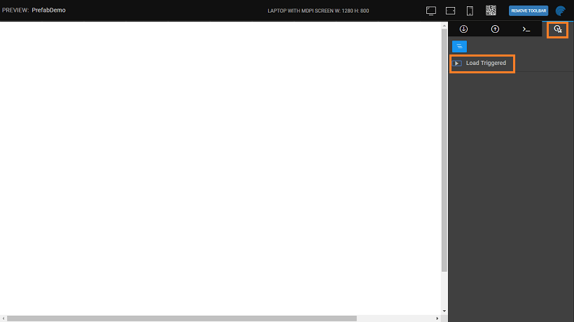 - on Load: this event is triggered whenever the page containing the Prefab loads or when the Prefab is dragged and dropped onto a page. This event is exposed to the Prefab user and can be further customized. It is displayed in the Events tab of the Prefab properties panel, after drag and drop in the project page.