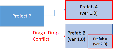 - Project P is using Prefab A ver 1.0 and Prefab B which internally uses Prefab A (ver 1.0).