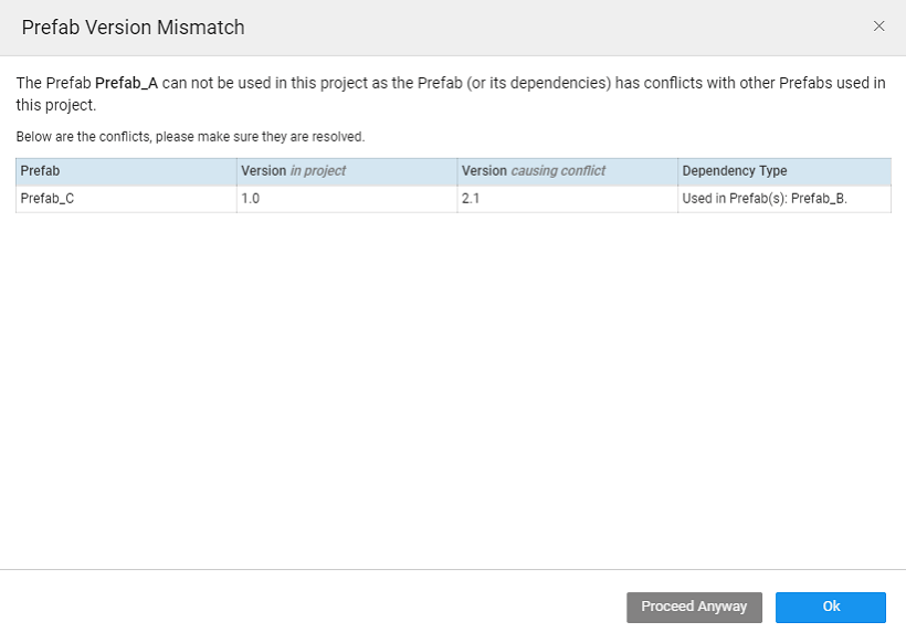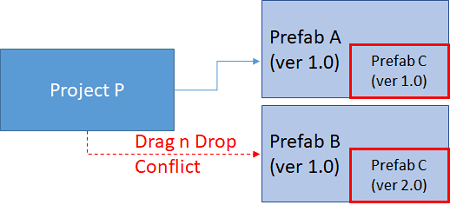 - Project P is using Prefab A which internally uses Prefab C (ver 1.0).