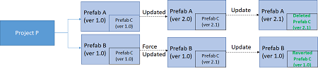 - If Project P updates Prefab A to ver 2.1, then the Prefab C in Prefab B will be reverted to the original ver 1.0.