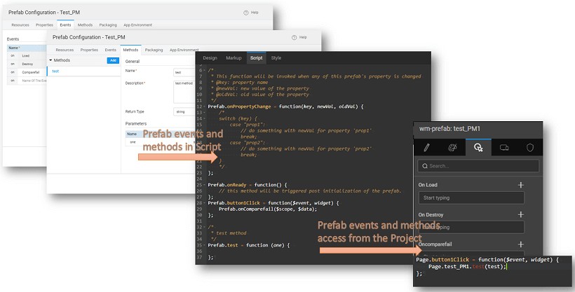 You can define functionality in JavaScript which can be used by the developer. The developer can choose to invoke these methods in any way within the application using the Prefab as follows: