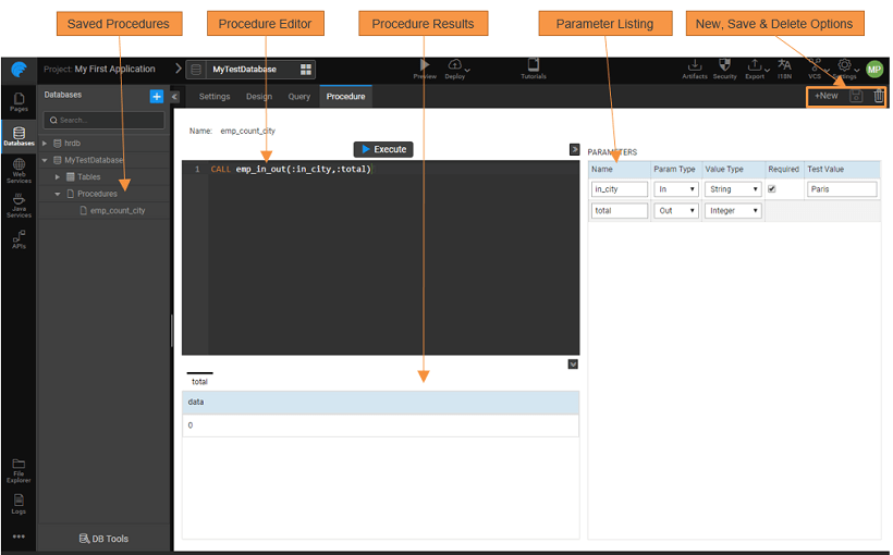 Procedure tab from WaveMaker Database Designer can be used to execute procedures that are written in and imported from the database using the call command. Execute the procedure calls and save them for the usage within the app by creating Variable using the generated APIs.