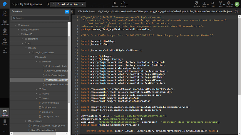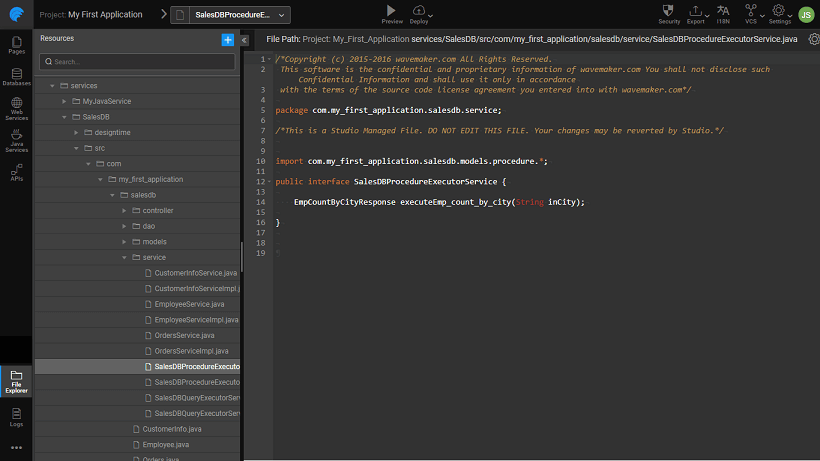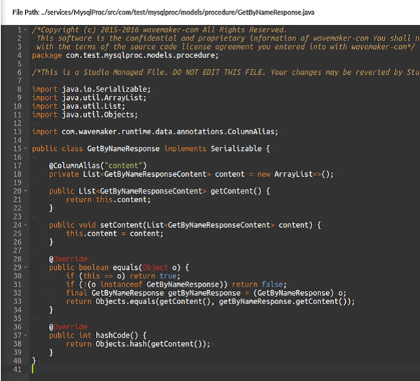 WaveMaker supports the execution of procedures/functions written using PL/SQL. You can find out more about Stored Procedures here. In this section, we will be seeing how WaveMaker supports Stored Procedures with the help of an example. We are using a MySQL database.