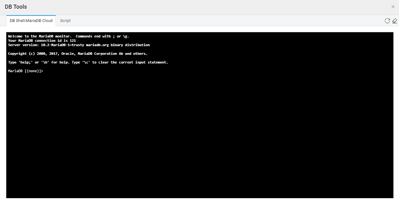 Upon clicking DB Tools from Databases Resource page, you will be shown the DB Shell- MariaDB Cloud tab which connects to the development database server and displays a command-line interface to execute database commands.