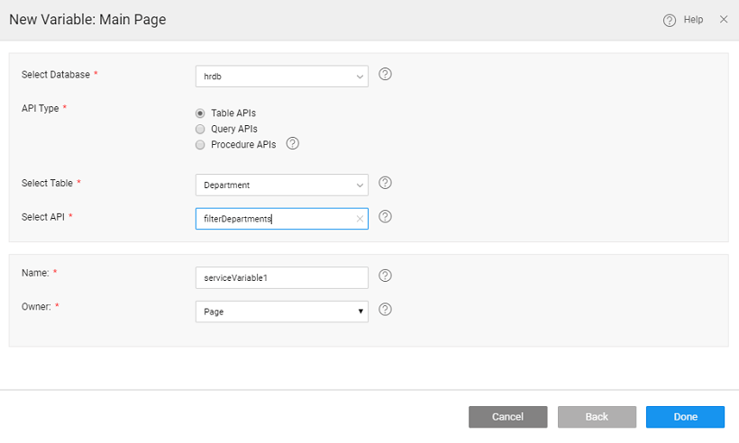 For every database table imported into the app, APIs are generated. In addition to the CRUD operations, functionalities like Count, Filter, Get by field name, Get associated table data etc. can be accessed through the corresponding APIs. These Database APIs also include those corresponding to Queries and Procedures created within the data model.