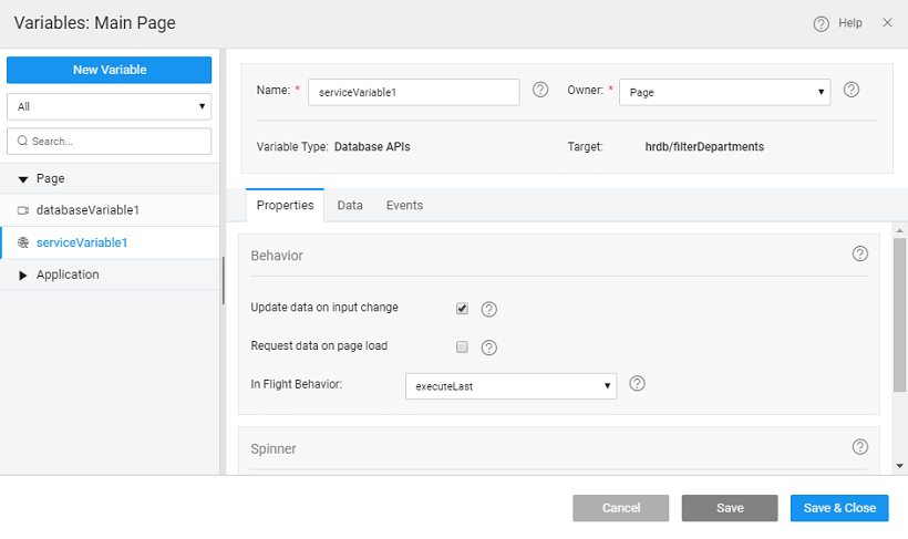- the properties tab contains all the properties like server options, behavior and spinner behavior. (Click on the Variable to view the Variable definition). Know more about properties.