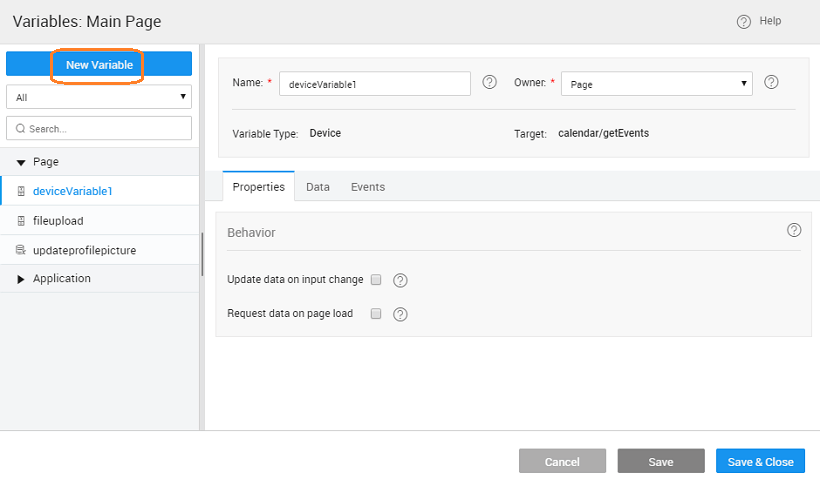 Request data on page load | If checked, 'Page' variable will be triggered on page load while 'Application' variable will be triggered on application load. |
