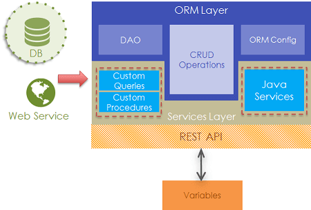 Custom queries, procedures, and Java Services can be used to extend the app functionality. For all these services, REST API is auto-generated using Spring-REST/Swagger.