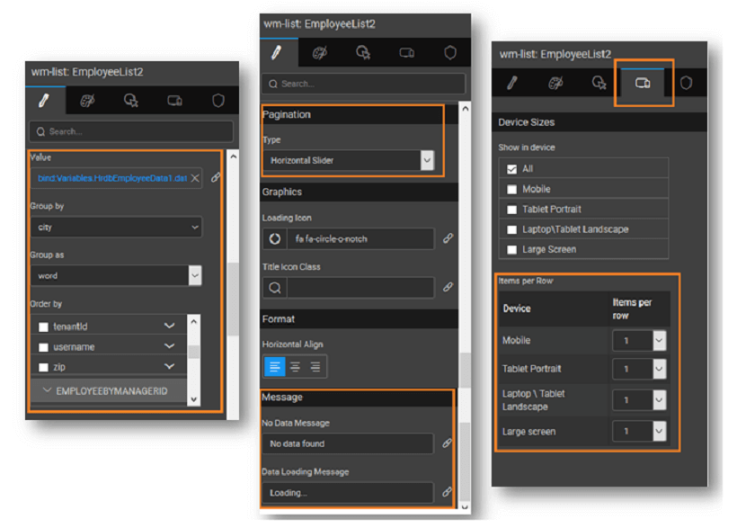 This property will help to order the list items based upon a field from the data source. You can also set the order as ascending or descending – by clicking on the arrows provided on the side of the field name.