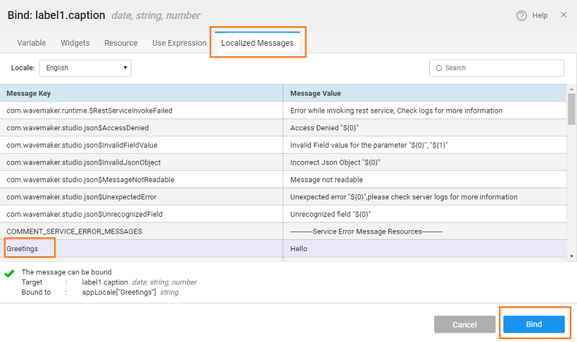1. To display messages, select the Label. Using the Properties Panel, you can bind the Caption or any other relevant property to any of the application messages of the project. Once you have bound all the relevant widgets to the messages, you should enable the application to show the message based on the user's locale.