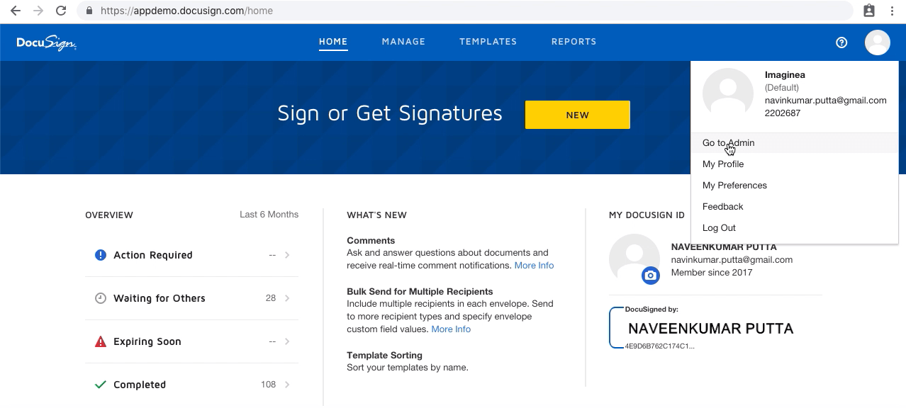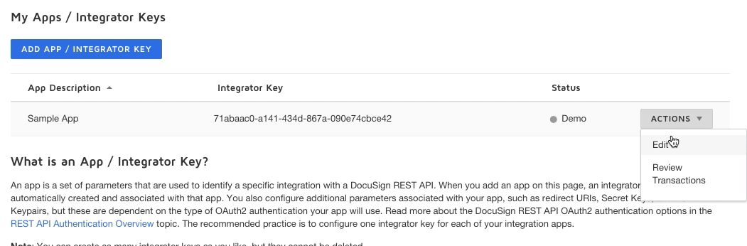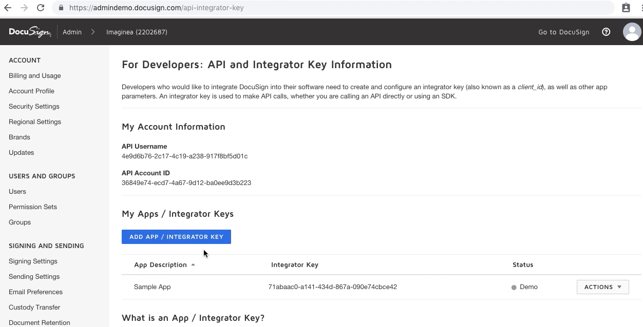 - Integrator Key: Provide the Integrator Key derived for your Docusign App from the Docusign Admin console.