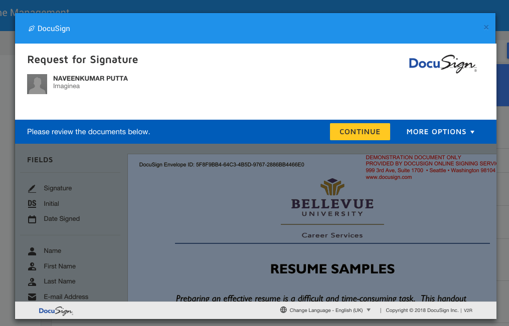 With the above steps done your Docusign prefab integration is complete. Now clicking on the E-sign link will invoke a Docusign dialogue and the your document will appear in the dialogue. Click continue to start the e-signing process. Click on the e-signing options from the left menu and e-sign the document. Then click finish button in the popup to complete the process.
