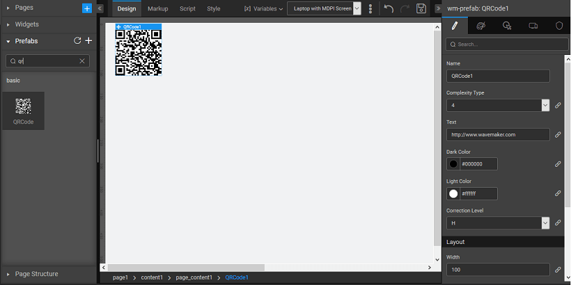 1. Drag and drop the QRCode prefab onto the canvas on any of the pages of your application.