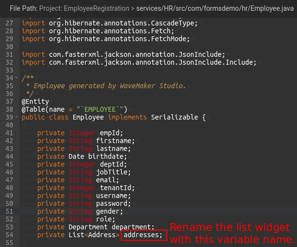 - Step-5: Drag and drop a List Widget inside the Parent Form (Employee LiveForm) and bind it to the model variable created in Step4.