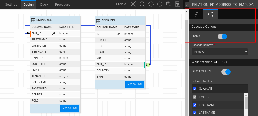 - Step-2: Enable the Cascade Option for the one-to-many relation as shown in the image below. For more information, see Working with Database Schema.