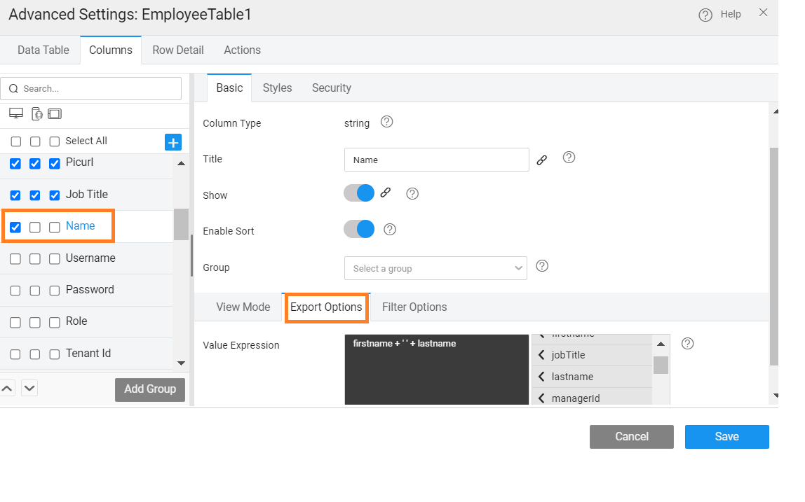 4. Navigate to Columns tab and note that for each column Export Options tab is visible. Use this to customize the data to be exported. NOTE: If you have any custom columns, value expression has to be given here, else the export will fail.
