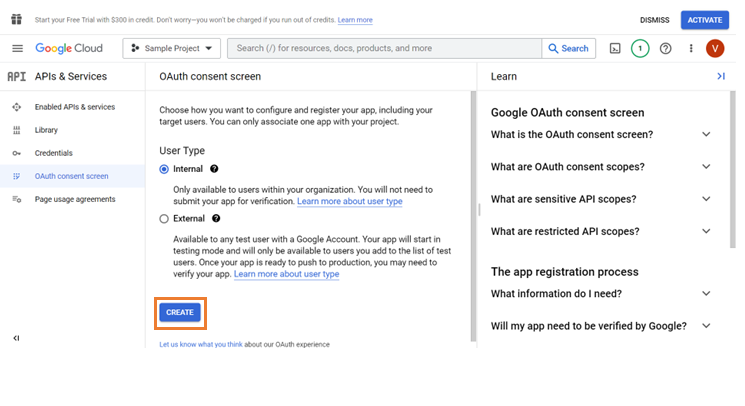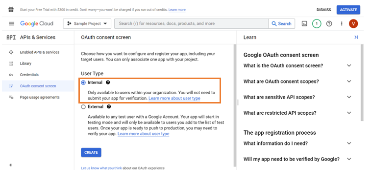 1. In OAuth consent screen, select the User Type to restrict the user accounts to access the application.