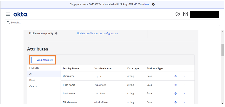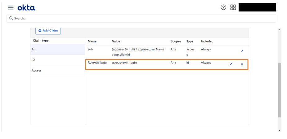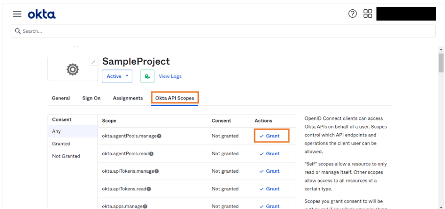 1. Go to Okta API Scopes and click Grant to include it as scope.