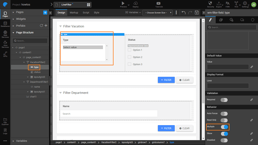 2. Bind the Live Filter to Database CRUD Variable with hrdb as Service and Vacation as Entity.
