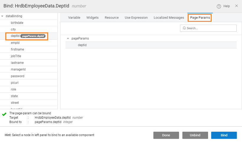 5. Page Parameter: Under Properties add page param - deptid of type integer.