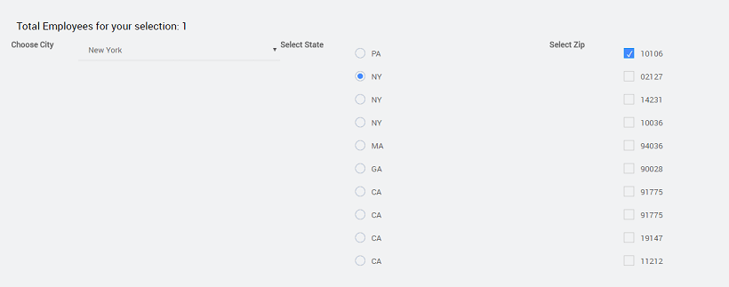 • The user will select the values for the three fields, city, zip and state using the Select, Radio and Checkbox widgets, respectively.