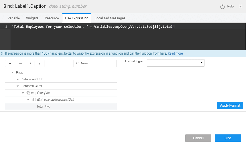 9. Bind the caption property of the Label widget to the output from the query
