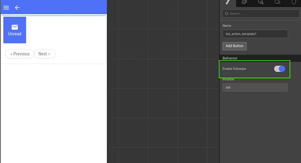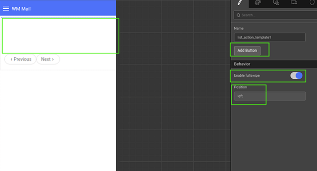 • The template contains Add Button, Enable fullswipe, and Position properties. Position property on the list action specifies the type of action template, that is, left or right action template.