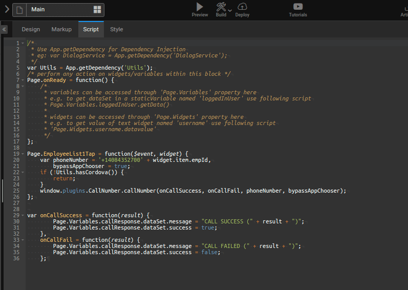 3. Now, plugin's API can be used. Since we need to make a call when the user taps on the list, set the on Tap event of the list to JavaScript and define the following JavaScript function to invoke the plugin API. Before invoking the Cordova API, a check has to be done whether Cordova is there. This will prevent errors in preview in browser.