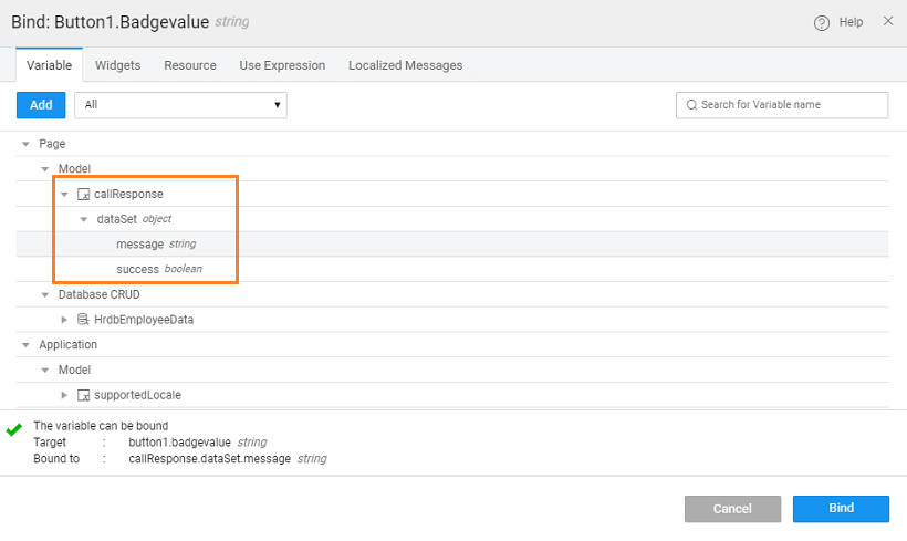 1. callResponse variable can be used in bindings. In the below image we are showing how a Button widget's Badge property can be used to display the call response message.