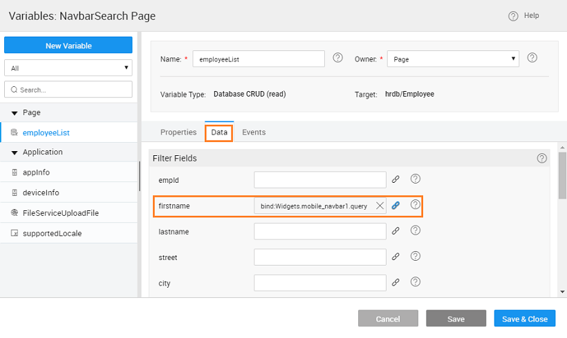 8. Select Mobile navbar, and set ‘On search’ Event to invoke employeeList