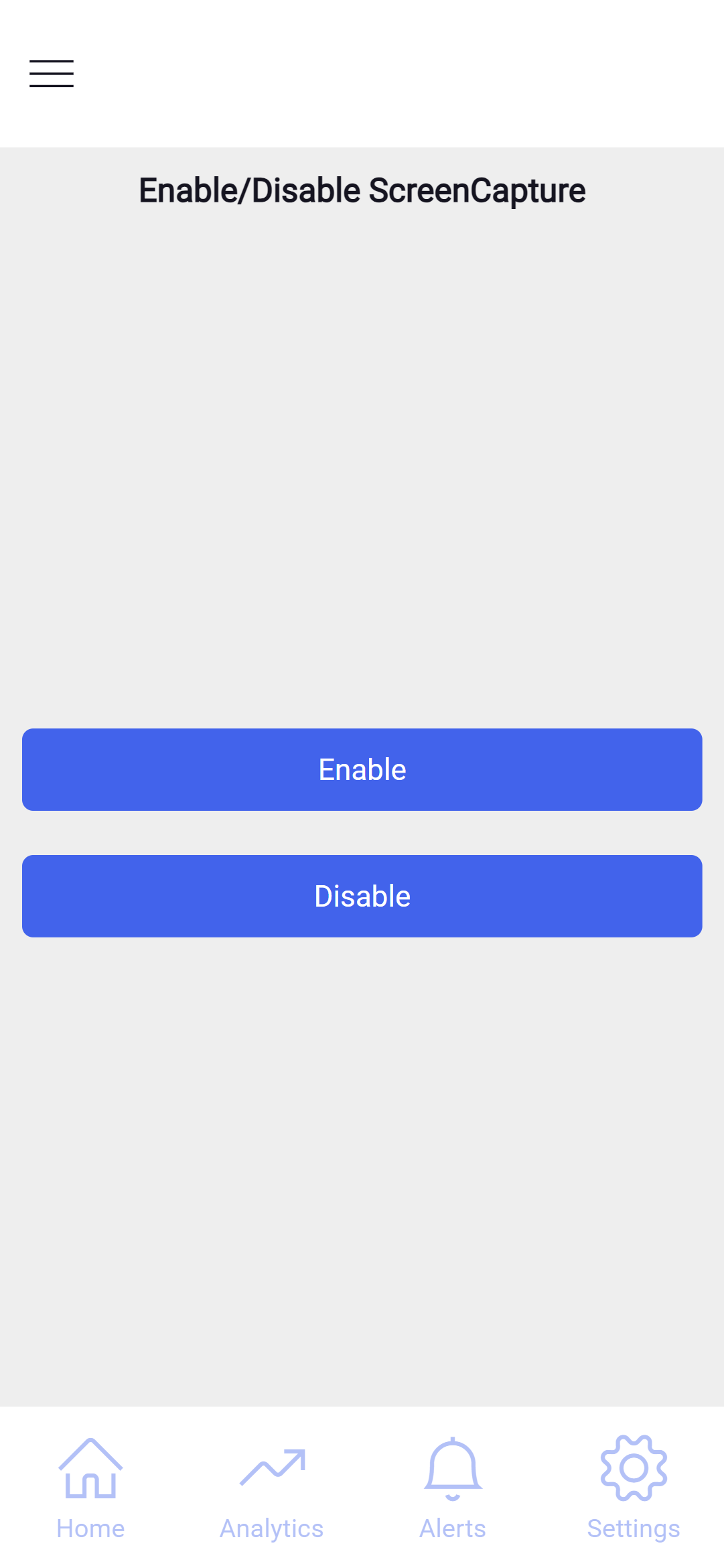 Some apps may require the ability to disable screen capture on app launch. For example, a banking app may want to disable for all screens to prevent sensitive information from being captured. In such cases, the ScreenCapture plugin can be leveraged as shown below: